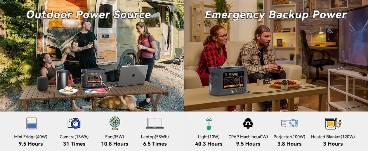 sinusoidal pura de CA de 600 W (1200 W de pico) y una capacidad impresionante de 448 Wh. El QE01D proporciona suficiente energía para hacer